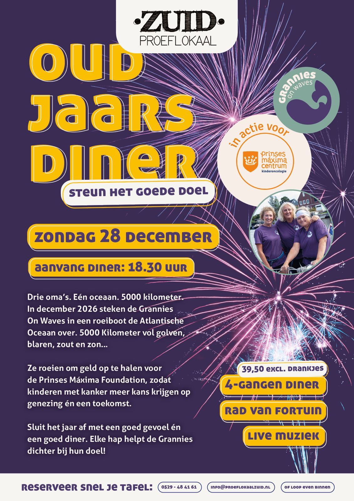 Proeflokaal Zuid is een laagdrempelige plek, ontspannen, niet al te serieus. Je kan er gewoon lekker een biertje bestellen, uit eten gaan of een feestje vieren. In dit gezellige proeflokaal staan proeven, genieten en gezelligheid bovenaan! En dat hebben we gemerkt op 28 december 2026, toen het jaarlijkse Oud & Nieuw-diner in het teken stond van de Grannies on Waves.