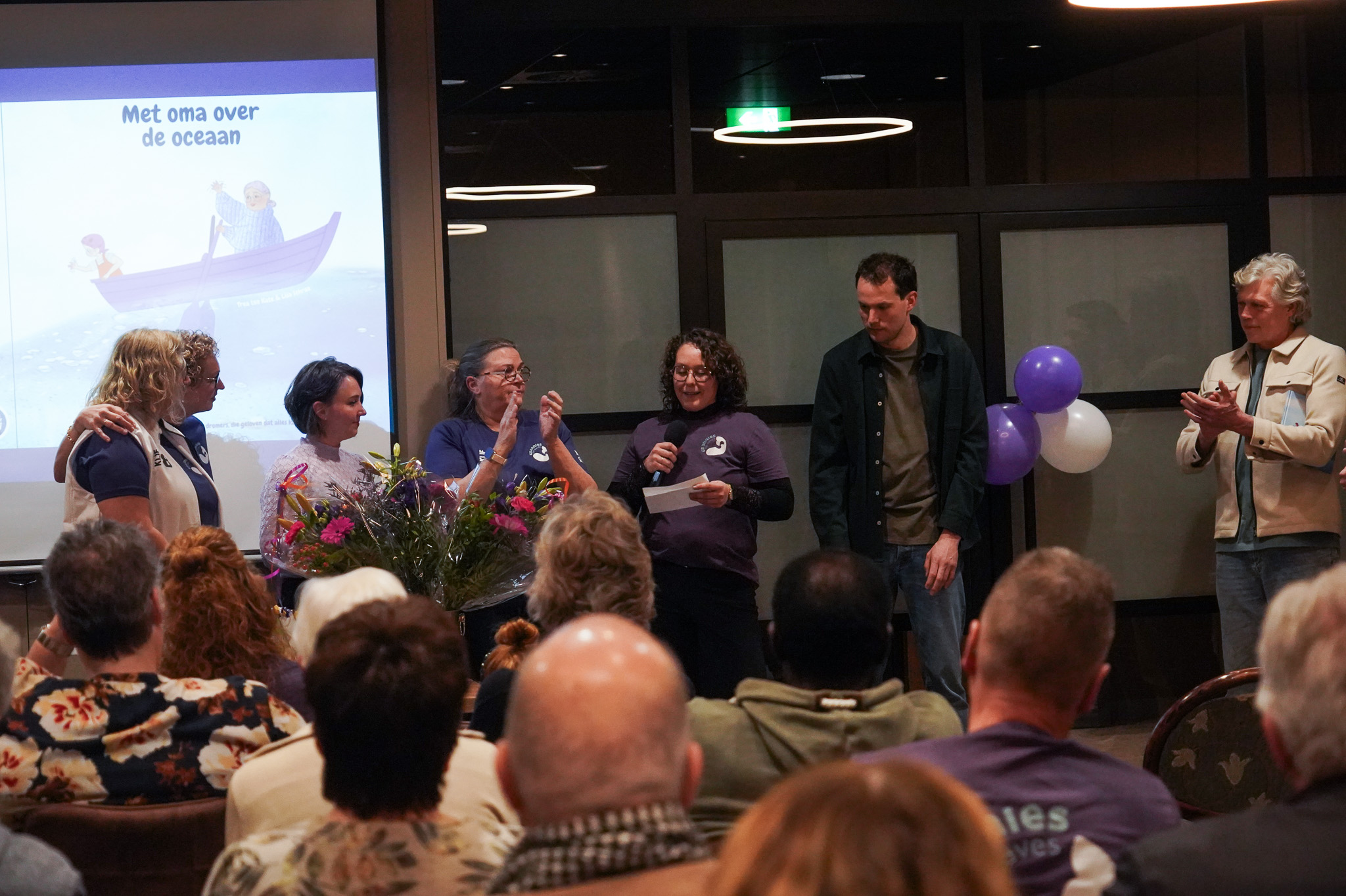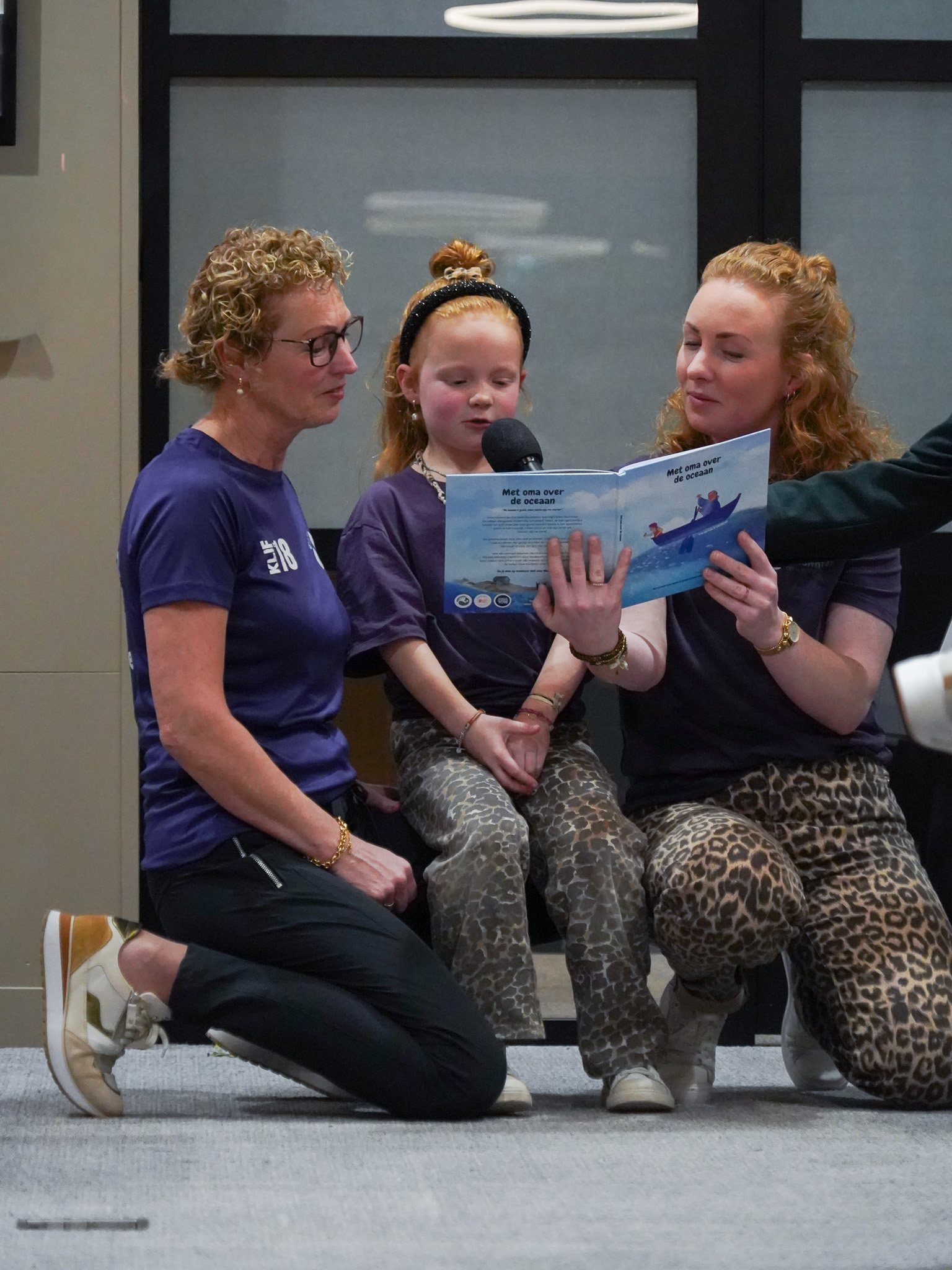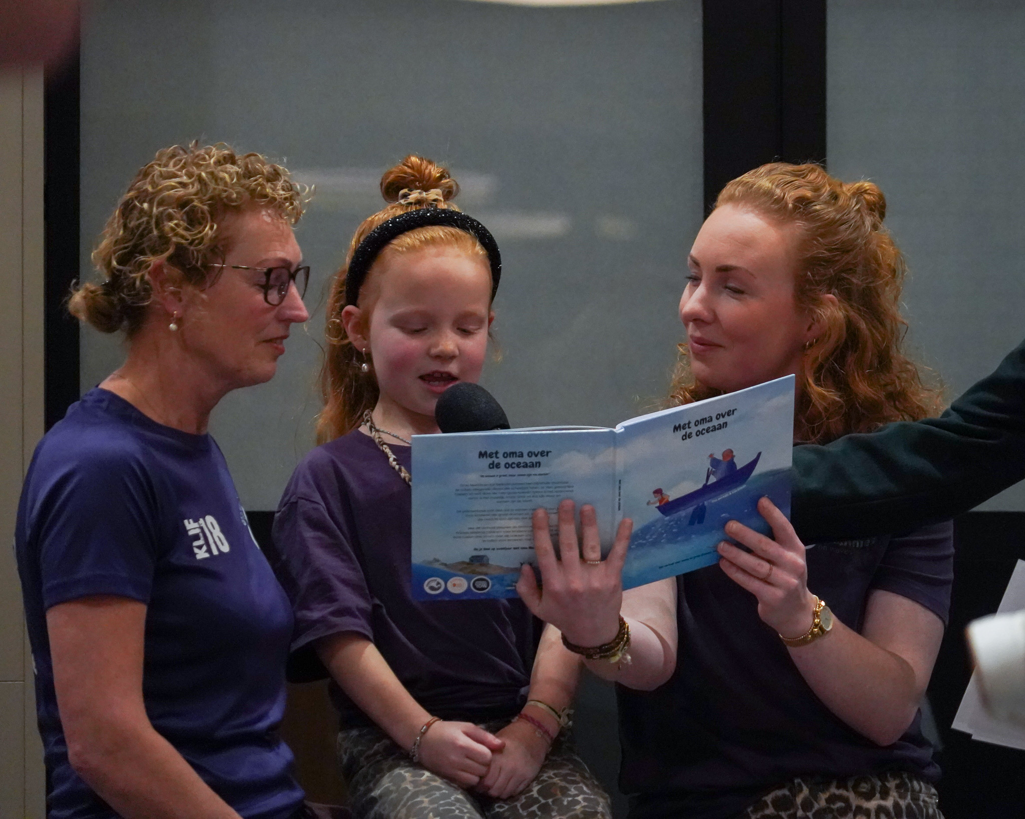 Granny Ineke kwam samen met haar dochter Amber en haar kleindochter Norah (8 jaar) naar voren. Norah las een pagina voor uit het boek. Haar heldere stem vulde de zaal en hier en daar werd een traantje weggepinkt.